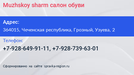 Muzhskoy sharm, салон обуви по адресу 364015, Чеченская республика, Грозный, Узуева, 2 в дальнейшем Организация, размещена в следующих категориях: