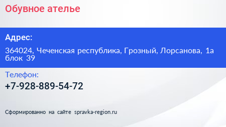 Обувное ателье по адресу 364024, Чеченская республика, Грозный, Лорсанова, 1а блок 39 в дальнейшем Организация, размещена в следующих категориях:
