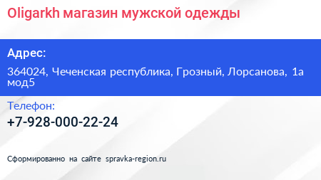 Oligarkh, магазин мужской одежды по адресу 364024, Чеченская республика, Грозный, Лорсанова, 1а мод5 в дальнейшем Организация, размещена в следующих категориях: