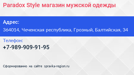 Paradox Style, магазин мужской одежды по адресу 364014, Чеченская республика, Грозный, Балтийская, 34 в дальнейшем Организация, размещена в следующих категориях: