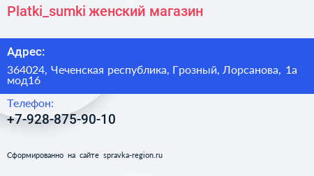 Platki_sumki, женский магазин по адресу 364024, Чеченская республика, Грозный, Лорсанова, 1а мод16 в дальнейшем Организация, размещена в следующих категориях: