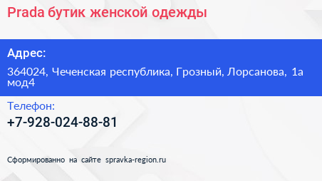 Prada, бутик женской одежды по адресу 364024, Чеченская республика, Грозный, Лорсанова, 1а мод4 в дальнейшем Организация, размещена в следующих категориях: