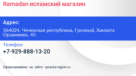 Ramadan, исламский магазин по адресу 364024, Чеченская республика, Грозный, Хамзата Орзамиева, 45 в дальнейшем Организация, размещена в следующих категориях: