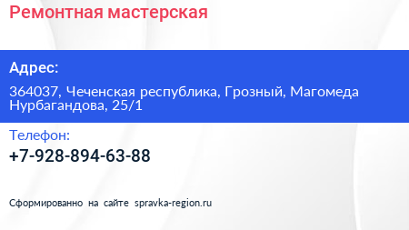Ремонтная мастерская по адресу 364037, Чеченская республика, Грозный, Магомеда Нурбагандова, 25/1 в дальнейшем Организация, размещена в следующих категориях:
