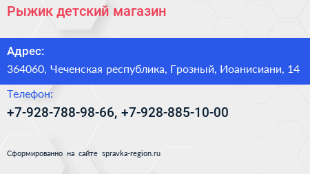 Рыжик, детский магазин по адресу 364060, Чеченская республика, Грозный, Иоанисиани, 14 в дальнейшем Организация, размещена в следующих категориях:
