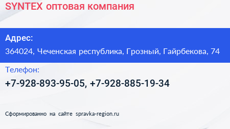 SYNTEX, оптовая компания по адресу 364024, Чеченская республика, Грозный, Гайрбекова, 74 в дальнейшем Организация, размещена в следующих категориях: