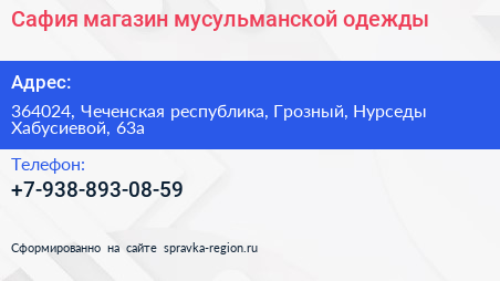 Сафия, магазин мусульманской одежды по адресу 364024, Чеченская республика, Грозный, Нурседы Хабусиевой, 63а в дальнейшем Организация, размещена в следующих категориях: