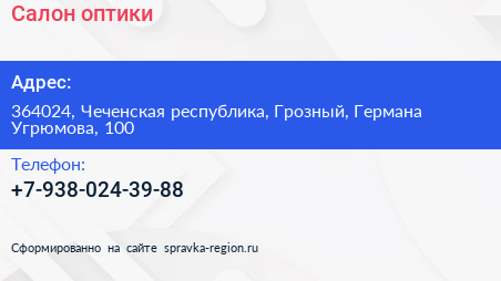 Салон оптики по адресу 364024, Чеченская республика, Грозный, Германа Угрюмова, 100 в дальнейшем Организация, размещена в следующих категориях: