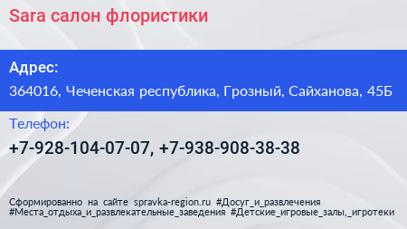 Sara, салон флористики по адресу 364016, Чеченская республика, Грозный, Сайханова, 45Б в дальнейшем Организация, размещена в следующих категориях: