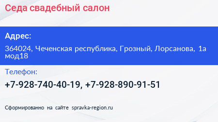 Седа, свадебный салон по адресу 364024, Чеченская республика, Грозный, Лорсанова, 1а мод18 в дальнейшем Организация, размещена в следующих категориях: