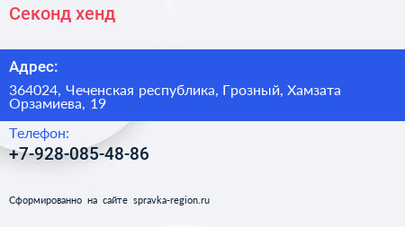 Секонд-хенд по адресу 364024, Чеченская республика, Грозный, Хамзата Орзамиева, 19 в дальнейшем Организация, размещена в следующих категориях: