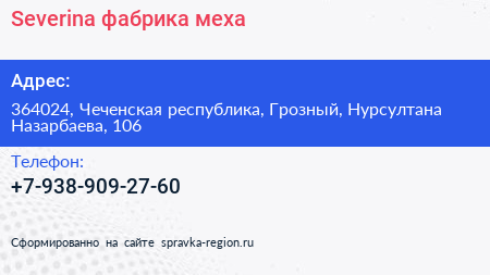 Severina, фабрика меха по адресу 364024, Чеченская республика, Грозный, Нурсултана Назарбаева, 106 в дальнейшем Организация, размещена в следующих категориях:
