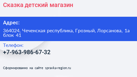 Сказка, детский магазин по адресу 364024, Чеченская республика, Грозный, Лорсанова, 1а блок 41 в дальнейшем Организация, размещена в следующих категориях: