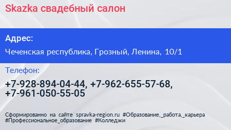 Skazka, свадебный салон по адресу Чеченская республика, Грозный, Ленина, 10/1 в дальнейшем Организация, размещена в следующих категориях:
