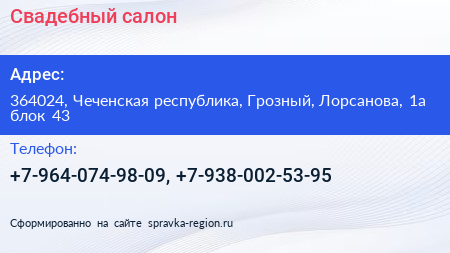 Свадебный салон по адресу 364024, Чеченская республика, Грозный, Лорсанова, 1а блок 43 в дальнейшем Организация, размещена в следующих категориях: