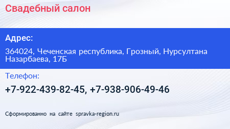 Свадебный салон по адресу 364024, Чеченская республика, Грозный, Нурсултана Назарбаева, 17Б в дальнейшем Организация, размещена в следующих категориях: