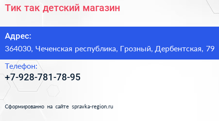 Тик-так, детский магазин по адресу 364030, Чеченская республика, Грозный, Дербентская, 79 в дальнейшем Организация, размещена в следующих категориях: