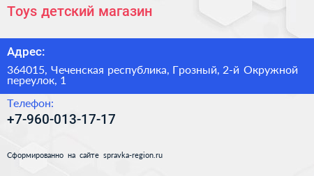 Toys, детский магазин по адресу 364015, Чеченская республика, Грозный, 2-й Окружной переулок, 1 в дальнейшем Организация, размещена в следующих категориях:
