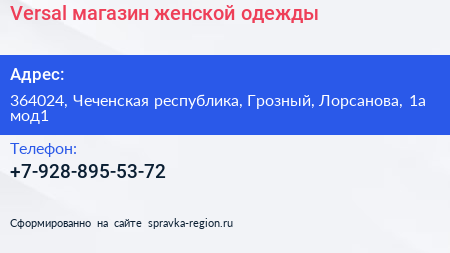 Versal, магазин женской одежды по адресу 364024, Чеченская республика, Грозный, Лорсанова, 1а мод1 в дальнейшем Организация, размещена в следующих категориях: