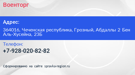 Военторг по адресу 364016, Чеченская республика, Грозный, Абдаллы 2 Бен Аль-Хусейна, 23Б в дальнейшем Организация, размещена в следующих категориях:
