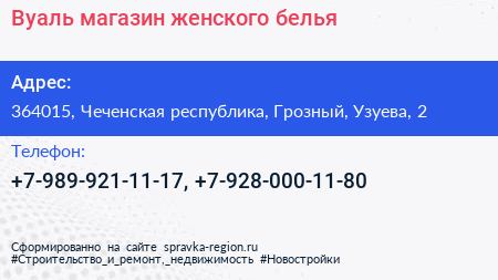 Вуаль, магазин женского белья по адресу 364015, Чеченская республика, Грозный, Узуева, 2 в дальнейшем Организация, размещена в следующих категориях: