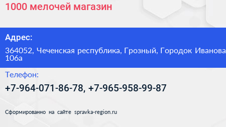 1000 мелочей, магазин по адресу 364052, Чеченская республика, Грозный, Городок Иванова, 106а в дальнейшем Организация, размещена в следующих категориях: