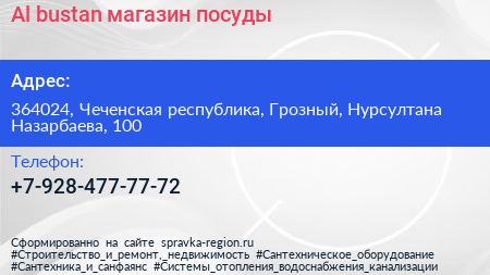 Al-bustan, магазин посуды по адресу 364024, Чеченская республика, Грозный, Нурсултана Назарбаева, 100 в дальнейшем Организация, размещена в следующих категориях: