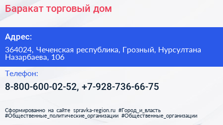 Баракат, торговый дом по адресу 364024, Чеченская республика, Грозный, Нурсултана Назарбаева, 106 в дальнейшем Организация, размещена в следующих категориях: