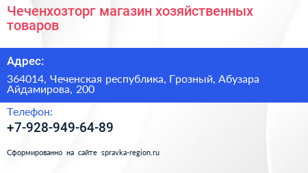 Чеченхозторг, магазин хозяйственных товаров по адресу 364014, Чеченская республика, Грозный, Абузара Айдамирова, 200 в дальнейшем Организация, размещена в следующих категориях: