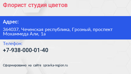 Флорист, студия цветов по адресу 364037, Чеченская республика, Грозный, проспект Мохаммеда Али, 1а в дальнейшем Организация, размещена в следующих категориях: