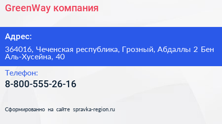 GreenWay, компания по адресу 364016, Чеченская республика, Грозный, Абдаллы 2 Бен Аль-Хусейна, 40 в дальнейшем Организация, размещена в следующих категориях: