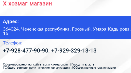 Х-хозмаг, магазин по адресу 364024, Чеченская республика, Грозный, Умара Кадырова, 16 в дальнейшем Организация, размещена в следующих категориях: