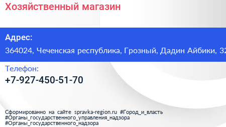 Хозяйственный магазин по адресу 364024, Чеченская республика, Грозный, Дадин Айбики, 32 в дальнейшем Организация, размещена в следующих категориях: