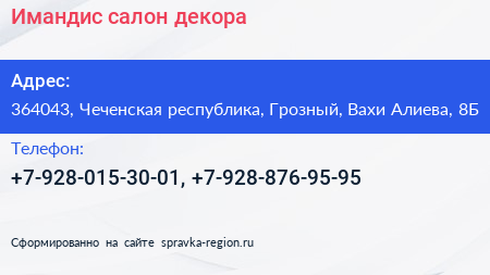 Имандис, салон декора по адресу 364043, Чеченская республика, Грозный, Вахи Алиева, 8Б в дальнейшем Организация, размещена в следующих категориях: