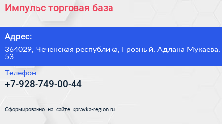 Импульс, торговая база по адресу 364029, Чеченская республика, Грозный, Адлана Мукаева, 53 в дальнейшем Организация, размещена в следующих категориях: