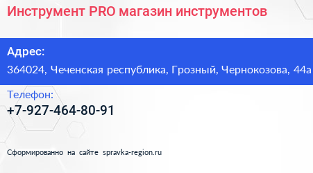 Инструмент PRO, магазин инструментов по адресу 364024, Чеченская республика, Грозный, Чернокозова, 44а в дальнейшем Организация, размещена в следующих категориях: