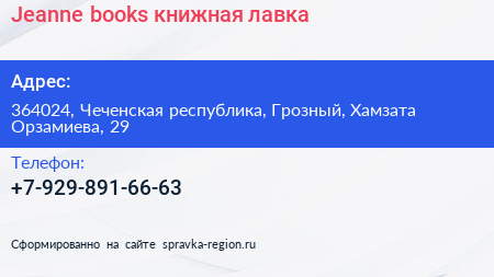 Jeanne books, книжная лавка по адресу 364024, Чеченская республика, Грозный, Хамзата Орзамиева, 29 в дальнейшем Организация, размещена в следующих категориях:
