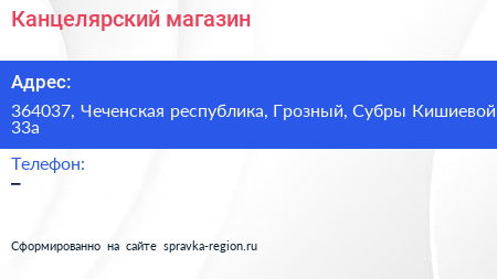 Канцелярский магазин по адресу 364037, Чеченская республика, Грозный, Субры Кишиевой, 33а в дальнейшем Организация, размещена в следующих категориях: