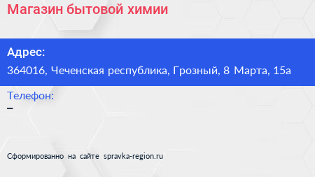 Магазин бытовой химии по адресу 364016, Чеченская республика, Грозный, 8 Марта, 15а в дальнейшем Организация, размещена в следующих категориях: