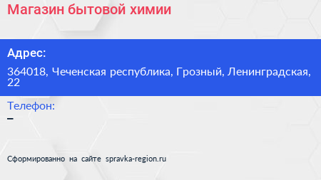 Магазин бытовой химии по адресу 364018, Чеченская республика, Грозный, Ленинградская, 22 в дальнейшем Организация, размещена в следующих категориях:
