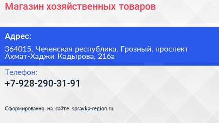 Магазин хозяйственных товаров по адресу 364015, Чеченская республика, Грозный, проспект Ахмат-Хаджи Кадырова, 216а в дальнейшем Организация, размещена в следующих категориях: