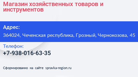 Магазин хозяйственных товаров и инструментов по адресу 364024, Чеченская республика, Грозный, Чернокозова, 45 в дальнейшем Организация, размещена в следующих категориях: