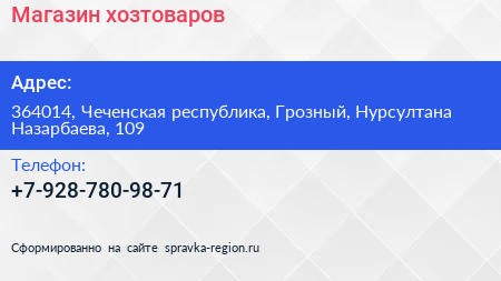 Магазин хозтоваров по адресу 364014, Чеченская республика, Грозный, Нурсултана Назарбаева, 109 в дальнейшем Организация, размещена в следующих категориях: