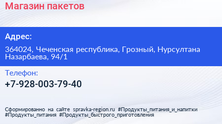 Магазин пакетов по адресу 364024, Чеченская республика, Грозный, Нурсултана Назарбаева, 94/1 в дальнейшем Организация, размещена в следующих категориях: