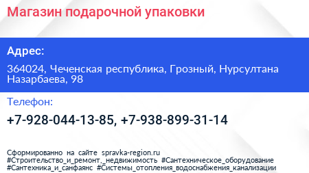 Магазин подарочной упаковки по адресу 364024, Чеченская республика, Грозный, Нурсултана Назарбаева, 98 в дальнейшем Организация, размещена в следующих категориях: