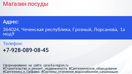 Магазин посуды по адресу 364024, Чеченская республика, Грозный, Лорсанова, 1а мод9 в дальнейшем Организация, размещена в следующих категориях: