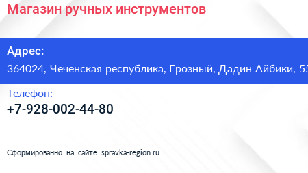 Магазин ручных инструментов по адресу 364024, Чеченская республика, Грозный, Дадин Айбики, 55 в дальнейшем Организация, размещена в следующих категориях: