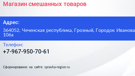 Магазин смешанных товаров по адресу 364052, Чеченская республика, Грозный, Городок Иванова, 106а в дальнейшем Организация, размещена в следующих категориях: