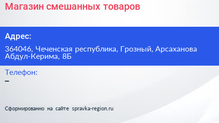 Магазин смешанных товаров по адресу 364046, Чеченская республика, Грозный, Арсаханова Абдул-Керима, 8Б в дальнейшем Организация, размещена в следующих категориях: