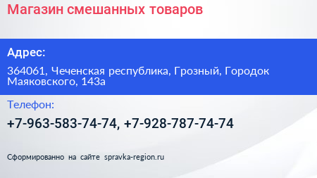 Магазин смешанных товаров по адресу 364061, Чеченская республика, Грозный, Городок Маяковского, 143а в дальнейшем Организация, размещена в следующих категориях: